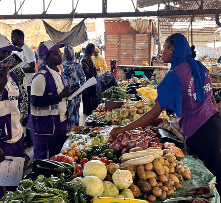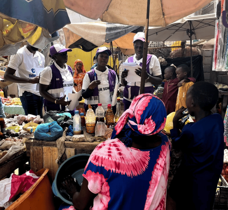 Un stand d’information a été installé au marché, pendant que des équipes de volontaires sillonnaient les rues pour échanger directement avec les habitants. Des questionnaires ont été administrés afin de recueillir les perceptions, les pratiques et les besoins des familles en matière d’hygiène et d’environnement.